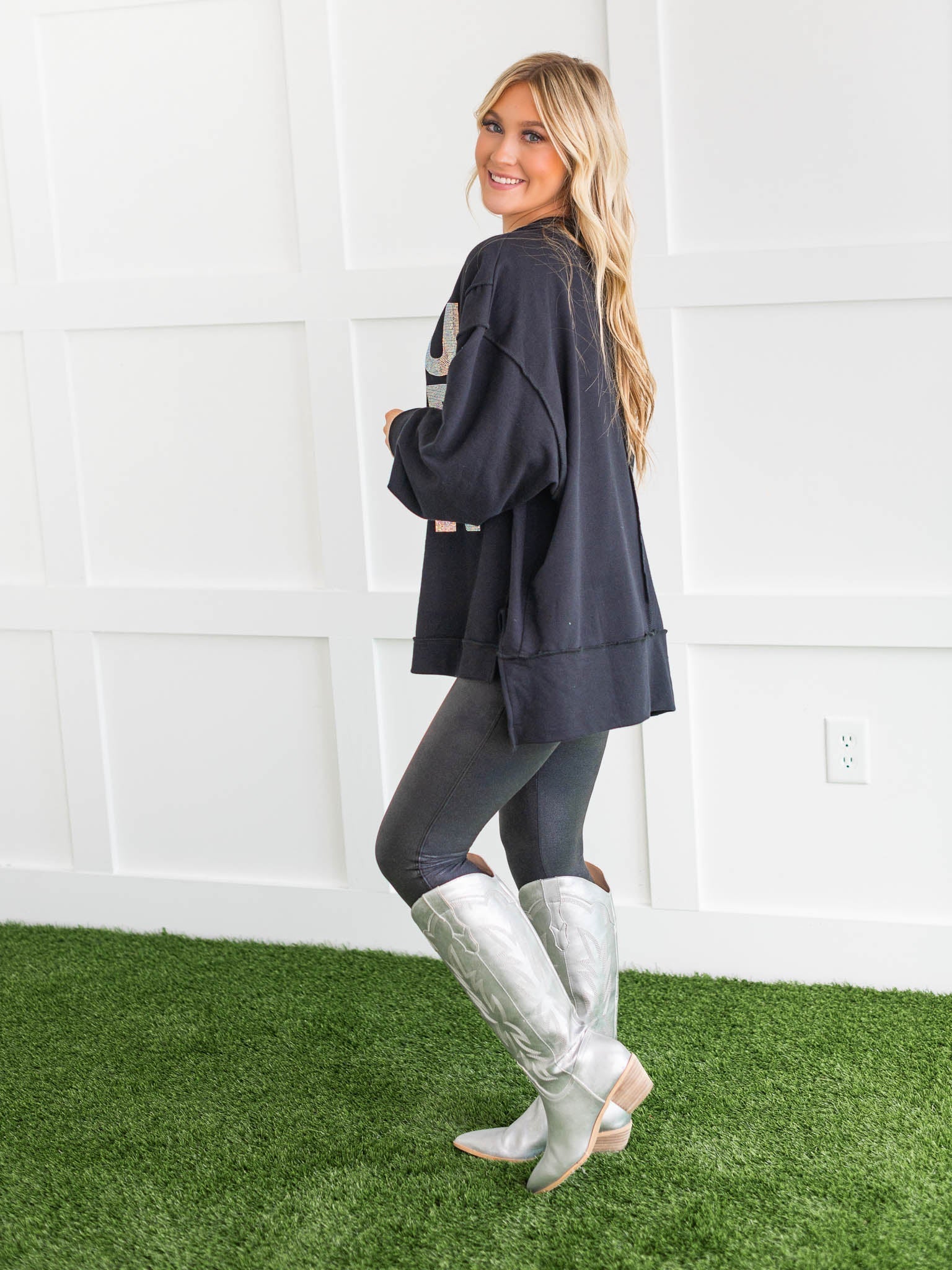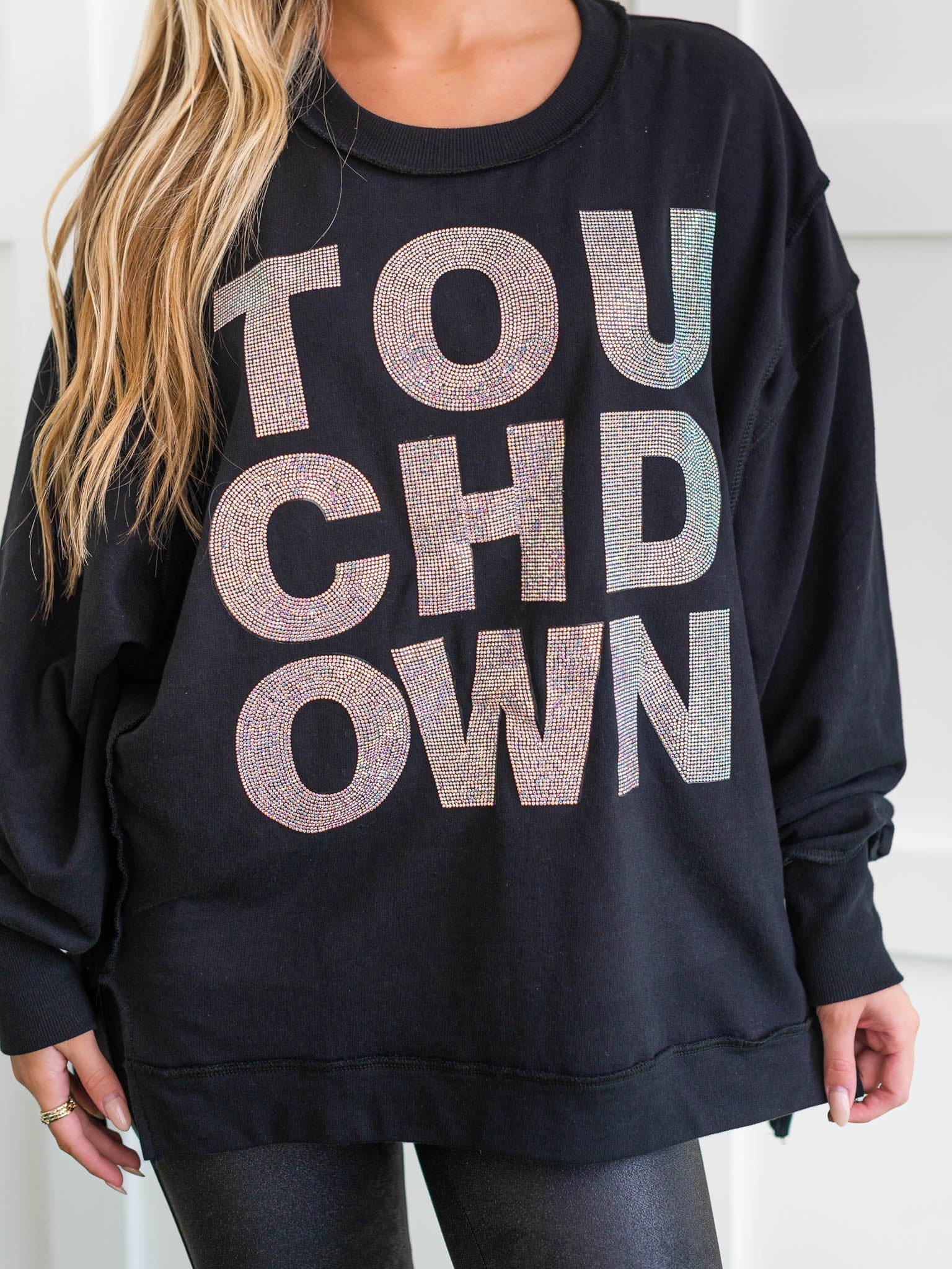 Look like the MVP at the next game with our Rhinestone Touchdown Pullover! Get ready for a winning season in French Terry oversized style, featuring exposed seams and side slits to add just the right amount of glamour! With a hi-low hem and a gorgeous rhinestone touchdown patch, you’ll be ready for a touchdown dance in no time! Score!!