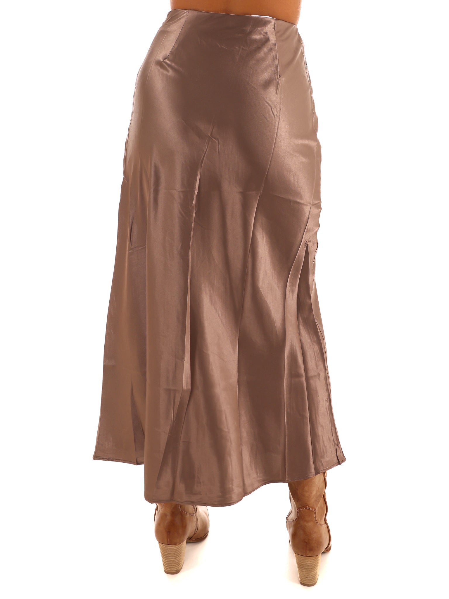 Unleash your elegance with the Satin Splendor Midi Skirt. Crafted from luxurious monochromatic satin, this skirt features a high waist and A-line flared shape for a flattering silhouette. The side invisible zipper ensures a seamless fit. A must-have for any fashionista!