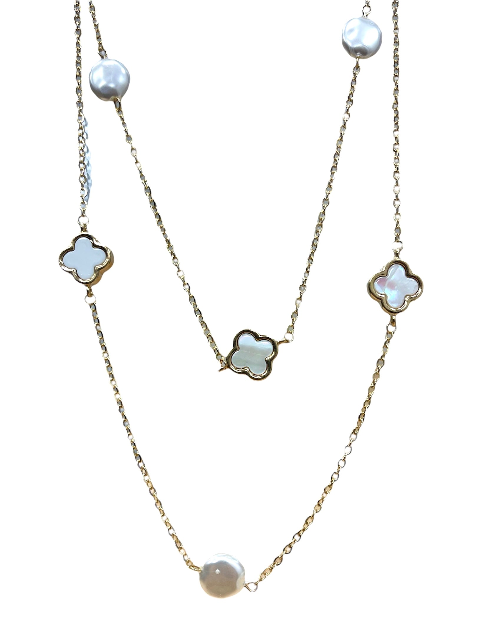 Add a touch of luck to your wardrobe with our Shell Pearl Clover Necklace. This unique piece features a clover-shaped pendant made from beautiful shell pearls, making you stand out from the crowd. Embrace your playful side with this quirky and fun necklace.