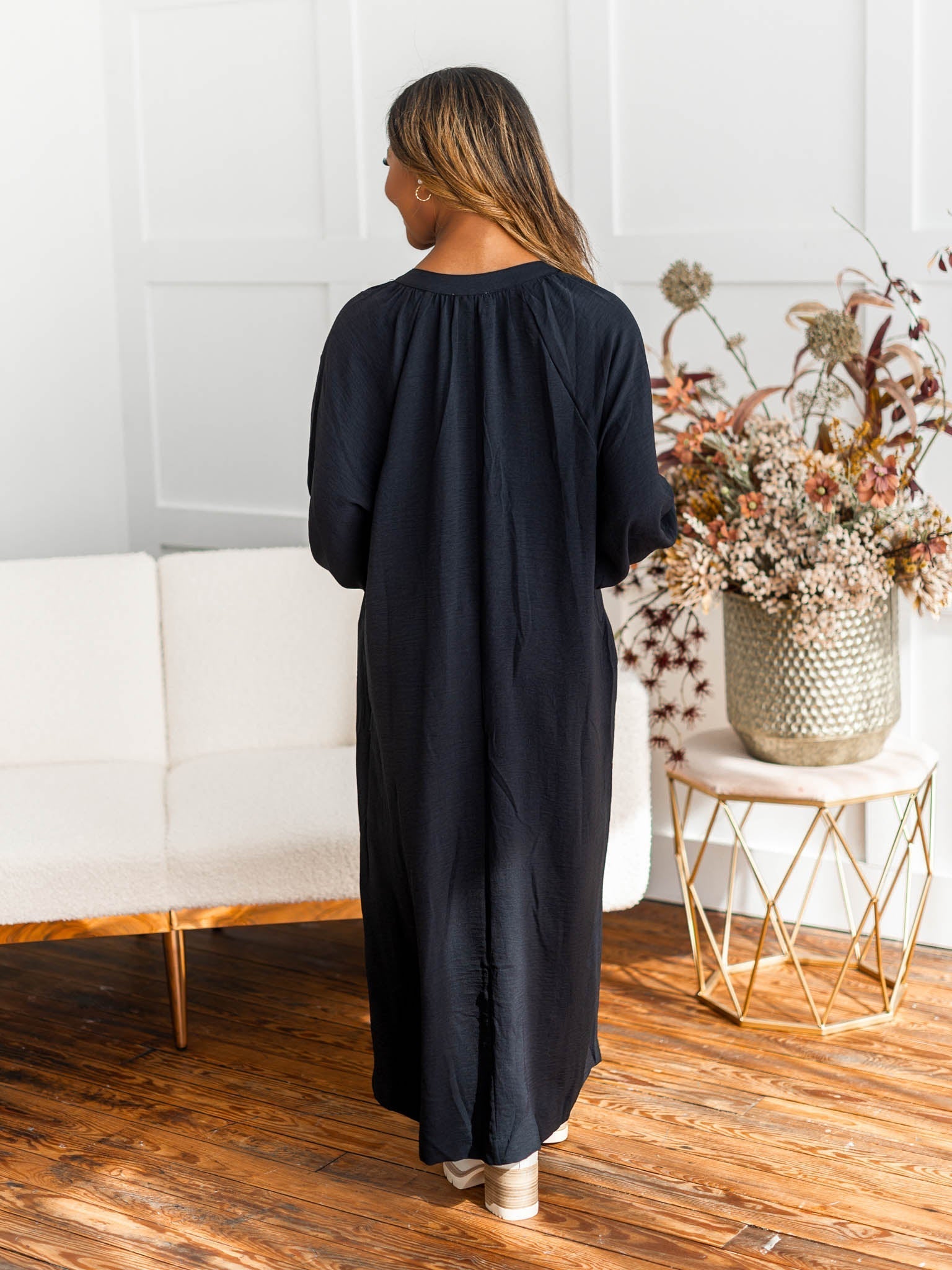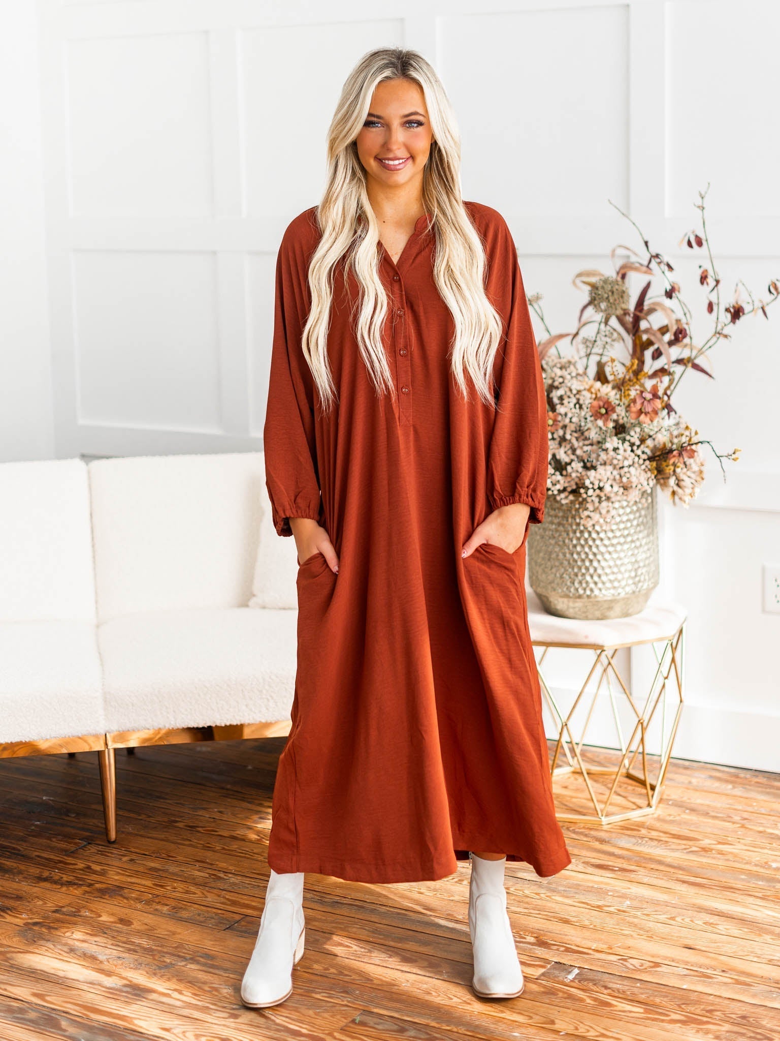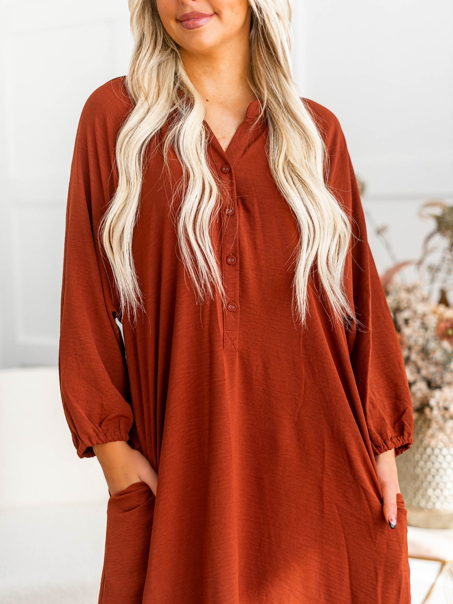 This midi dress is sure to turn heads! With its vintage-inspired half button-up style and V-notched neckline, you can't go wrong. And don't forget the pin tuck details giving the dress an extra dose of character. Say it all without speaking a word!
