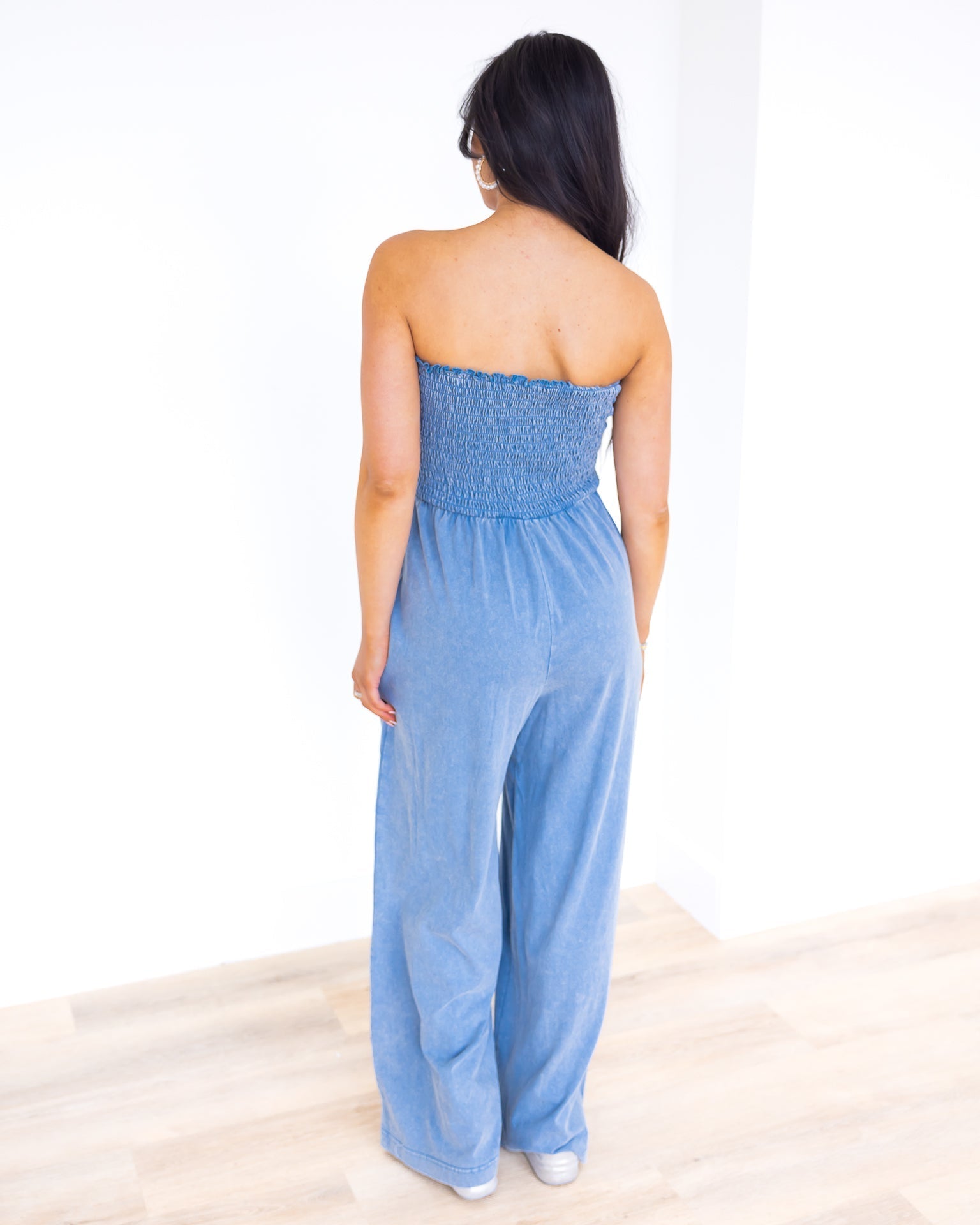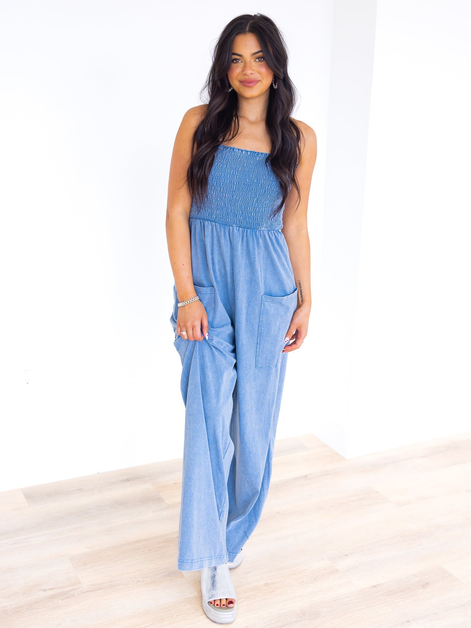 Looking for something stylish to wear this summer? The Something That I Want Strapless Jumpsuit has got you covered! Featuring a mineral washed design, smocked chest, and open front pockets, this jumpsuit combines fashion and function. Its relaxed silhouette and straight leg style make it versatile for any occasion.