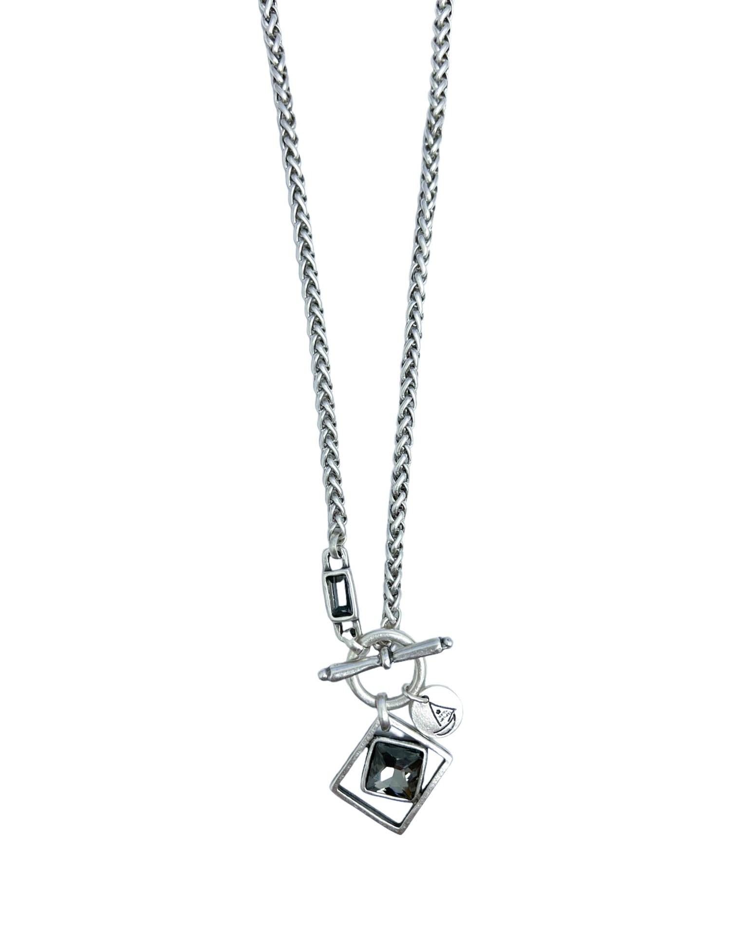 Silver necklace Square pendant with gray rhinestone Chainlink