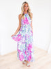 Elevate your style with our Sunday Best Floral Maxi Dress. The halter neck and tiered ruffle hemline add a touch of whimsy, while the smocked waistband ensures a flattering fit. The bold floral print is sure to turn heads. Perfect for any occasion!