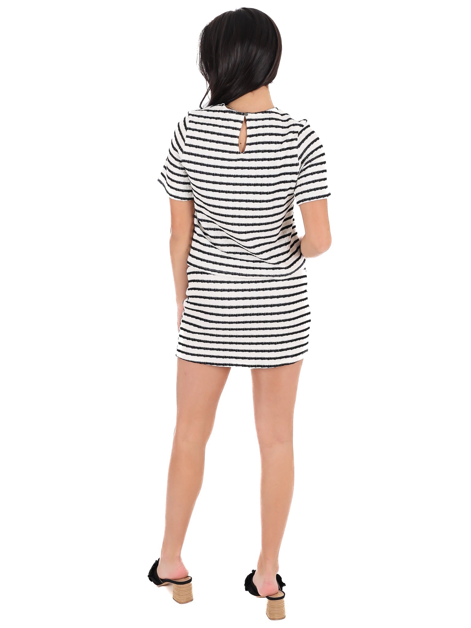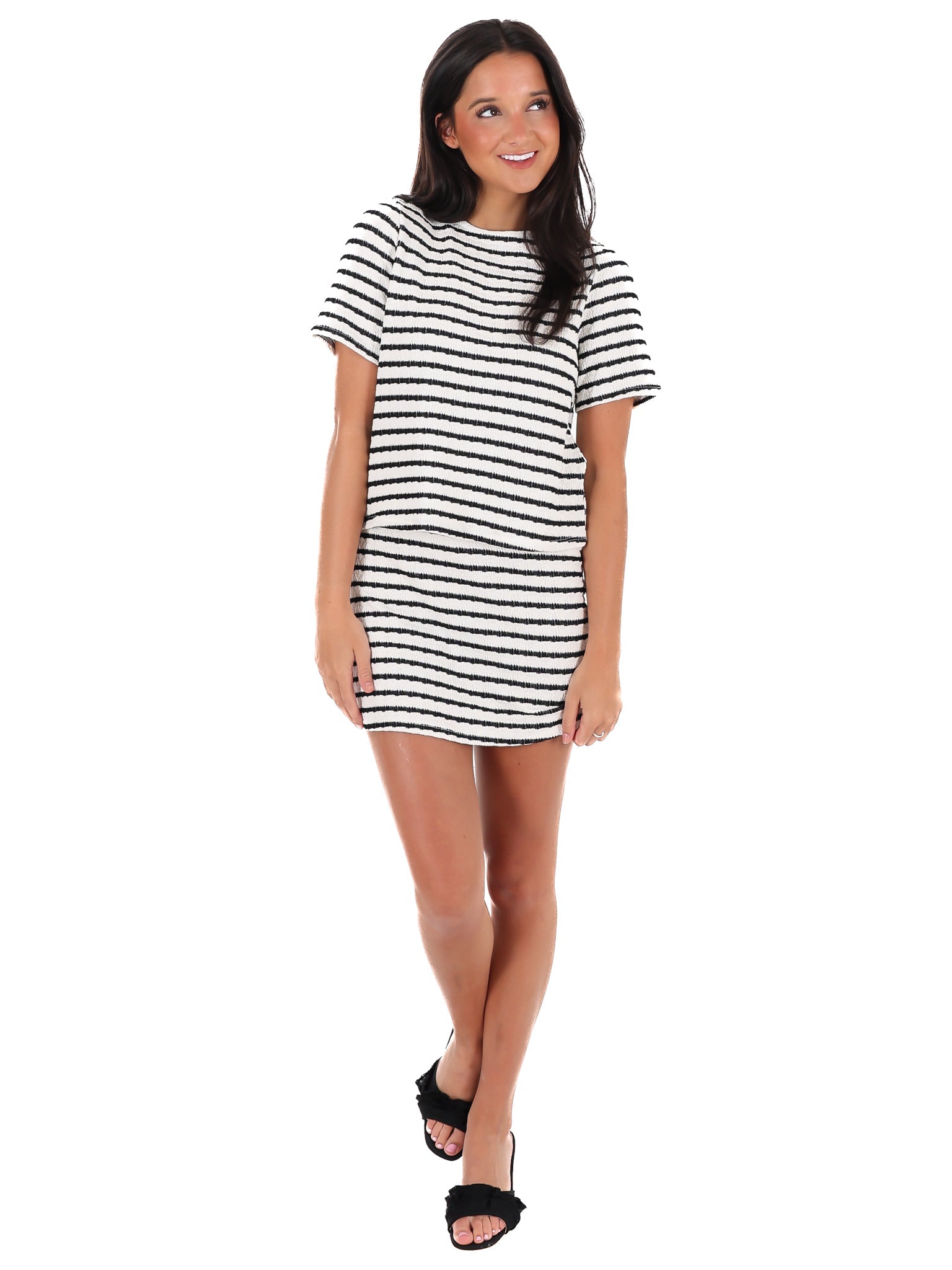Get ready to turn heads with our Sweetest Soul Stripe Mini Skirt Set! This two piece set features a trendy stripe top and mini skirt, perfect for any occasion. Upgrade your wardrobe and show off your playful side with this must-have outfit!