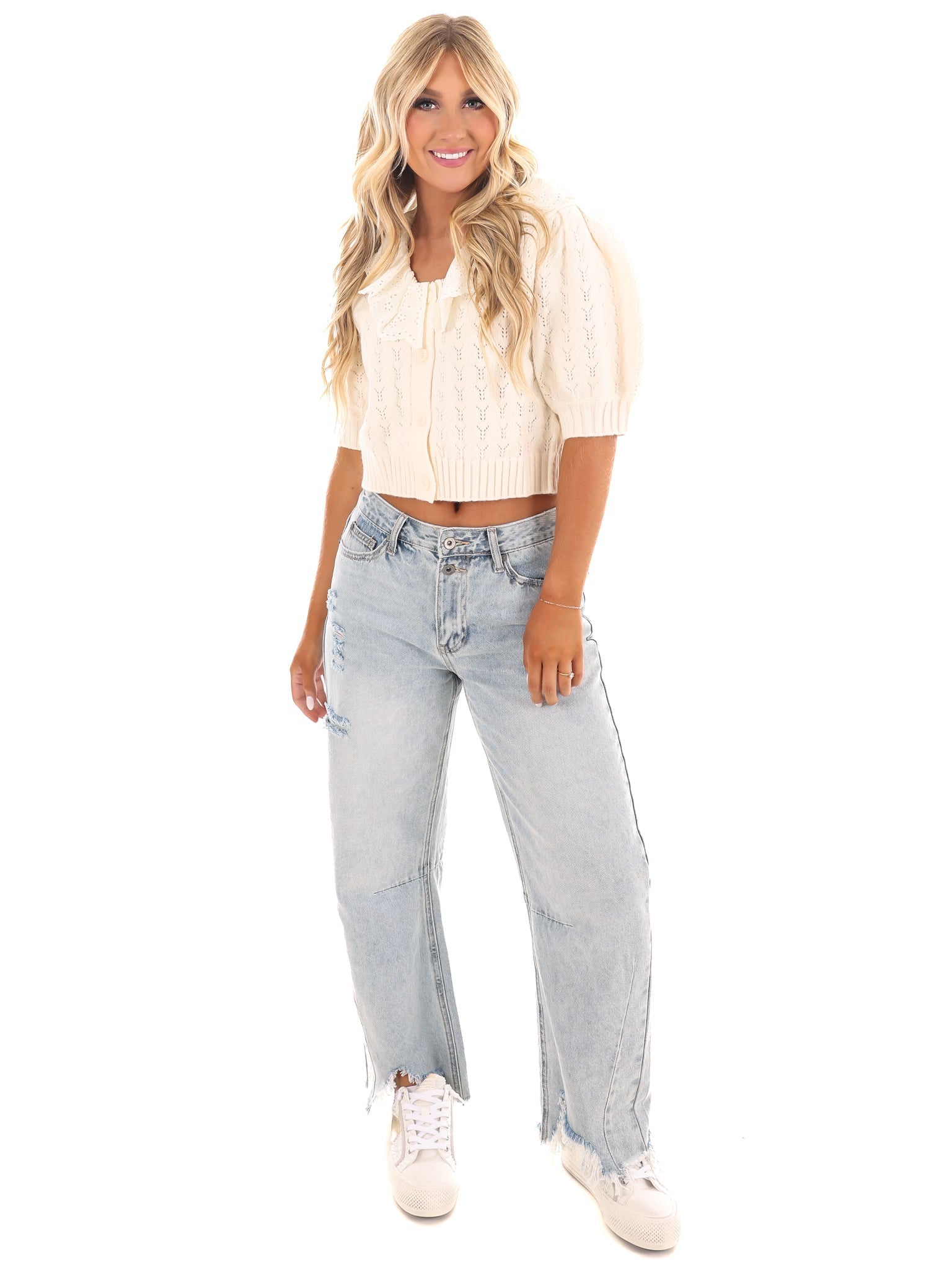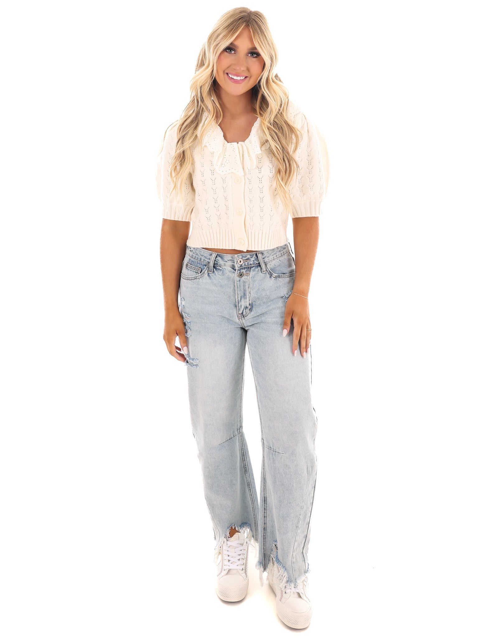 Get ready to speak the language of fashion with Talk My Language! This charming cardigan features playful puff sleeves and a delicate lace crochet collar, adding a touch of whimsy to your wardrobe. Perfect for any occasion, it's a must-have for any fashionista's closet.