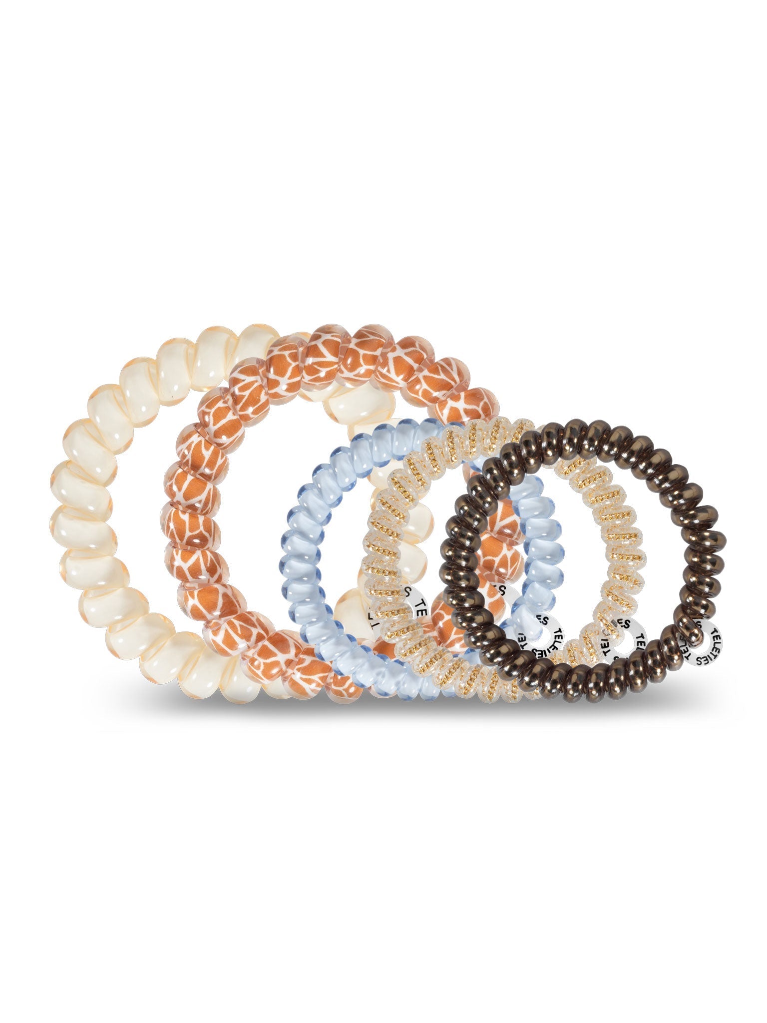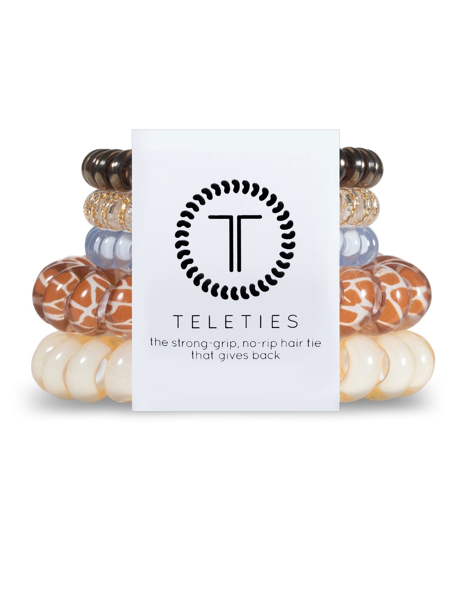 Hold your hair and enhance your style with TELETIES. The strong grip, no rip hair tie that doubles as a bracelet. Strong, pretty and stylish, TELETIES are designed to withstand everyday demands while taking your look to the next level. Sold in packs of three. The large size is 6.5cm wide x 1cm thick.
