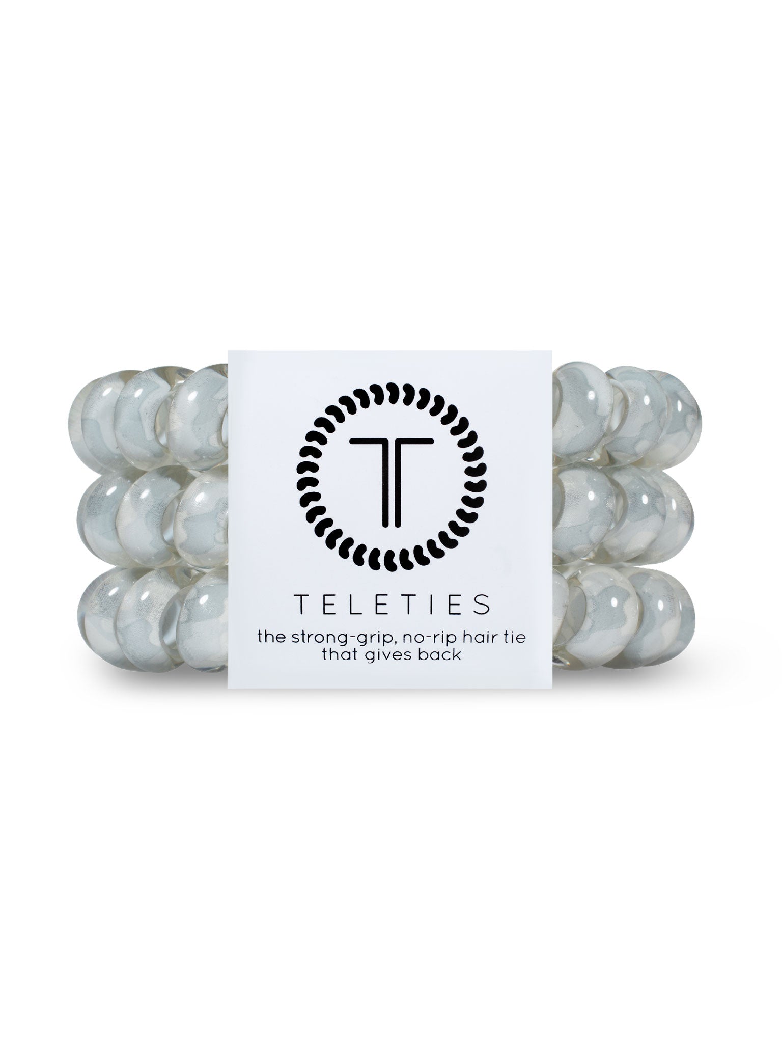 Hold your hair and enhance your style with TELETIES. The strong grip, no rip hair tie that doubles as a bracelet. Strong, pretty and stylish, TELETIES are designed to withstand everyday demands while taking your look to the next level. Sold in packs of three. The large size is 6.5cm wide x 1cm thick.