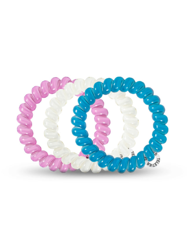 Hold your hair and enhance your style with TELETIES. The strong grip, no rip hair tie that doubles as a bracelet. Strong, pretty and stylish, TELETIES are designed to withstand everyday demands while taking your look to the next level. Sold in packs of three. The large size is 6.5cm wide x 1cm thick.