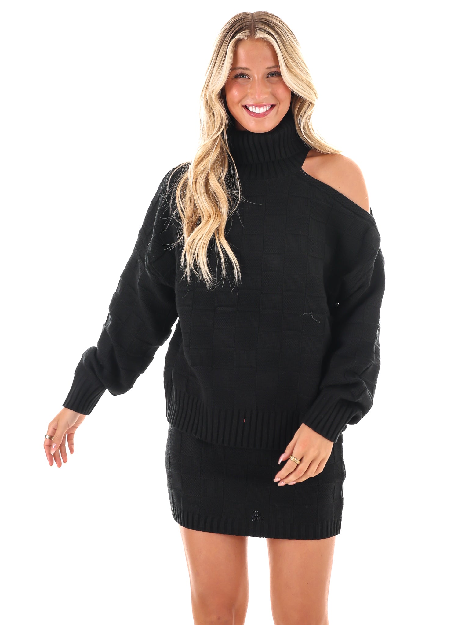Experience style and comfort with our Weave and Wear Two Piece Set! Brave the elements while looking chic in this basketweave design. The relaxed sweater features a turtleneck and cold-shoulder cutout, while the matching skirt has an elastic waist. Perfect for any occasion!